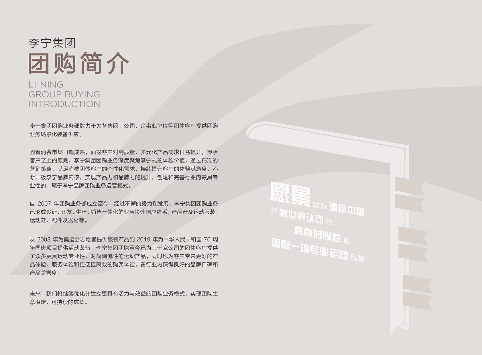 李宁集团团购业务部致力于为各集团、公司、企事业单位等团体客户提供团购业务场景化装备供应。